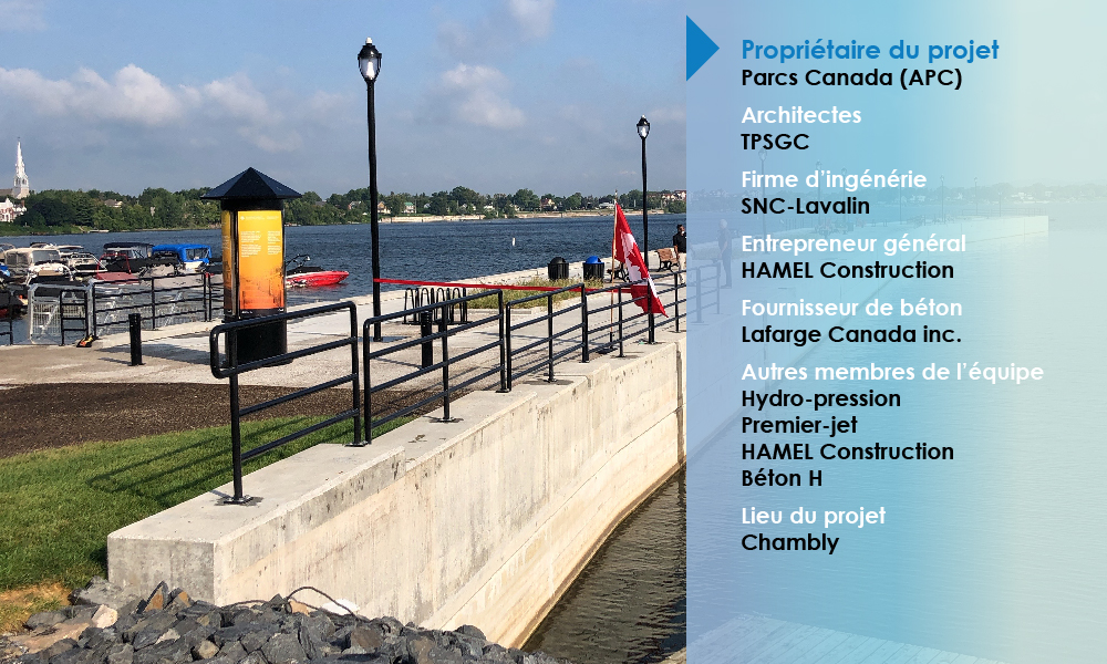 Le projet consistait premièrement à démolir des murs de couronnement existants en béton. Par la suite, de nouveaux murs de parement et de couronnement ont été construits, ainsi qu’une dalle structurale en béton armé pour un visuel rappelant les couleurs du Fort-Chambly. Le quai étant situé dans une zone environnementale sensible, les travaux devaient respecter de nombreuses contraintes environnementales dont : l’utilisation d’huiles biodégradables pour la machinerie, la mise en place de rideaux de turbidité, des barges approuvées par Transports Canada, etc.