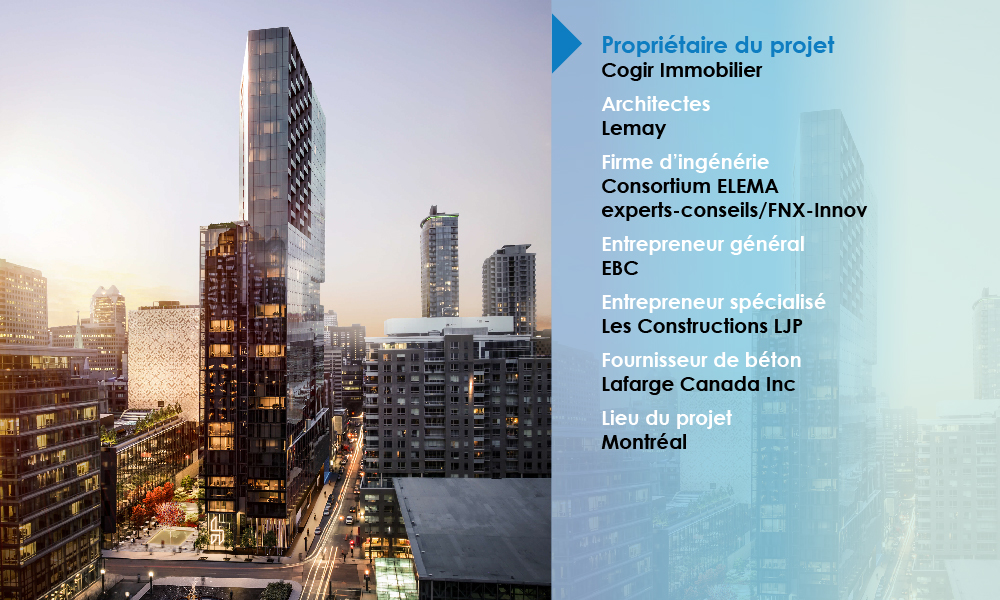 En tant que bâtiment multi-usage de grande hauteur, la superposition des trames de colonnes en lien avec les différentes fonctions (stationnements aux sous-sols, espaces commerciaux au rez-de-chaussée, espaces de bureaux/réunions aux premiers étages, chambres d’hôtels et espaces de condos/locatifs dans le restant de la tour) a nécessité une grande coordination avec l’équipe en architecture et en design d’intérieur afin de minimiser les coûteuses poutres de transfert pouvant pénalisées les hauteurs de plafond et le passage horizontal des éléments électro-mécanique. Un blocage de ces éléments horizontaux peut occasionner un dédoublement de puits verticaux et par le fait même, une perte de superficie « vendante » pour le client.
