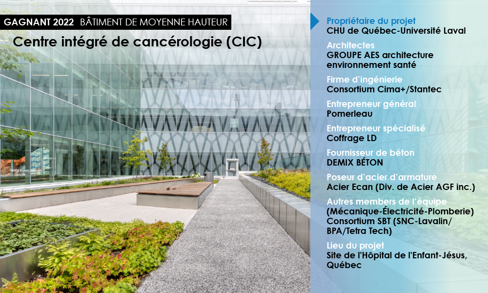 Un nombre important d'éléments structuraux sont apparents dans le CIC. En harmonie avec la signature architecturale du bâtiment, des mélanges et des méthodes de mise en place ont été élaborés afin d'obtenir un fini impeccable pour toutes les surfaces apparentes. Le positionnement de plaques encastrées apparentes n'a également pas été laissé au hasard et a fait l'objet d'un suivi accru lors des étapes de construction.