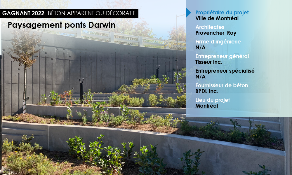 Dans ce projet, pratiquement tous les aspects ont été considérés. D'abord, le client (la Ville de Montréal) a exigé qu'un ciment ternaire (ciment incorporant des ajouts cimentaires tels que la fumée de silice, les cendres volantes ou le laitier de fourneau) soit utilisé et qu'on y ajoute de la poudre de verre. La poudre de verre (obtenue en broyant le verre jusqu'à l'obtention d'une poudre extrêmement fine) est de plus et plus utilisée par la Ville de Montréal - comme ce fût le cas pour le Pont Darwin - notamment pour son aspect environnemental. De plus, de la fibre de verre a été ajoutée au mélange afin d'en augmenter la durabilité.