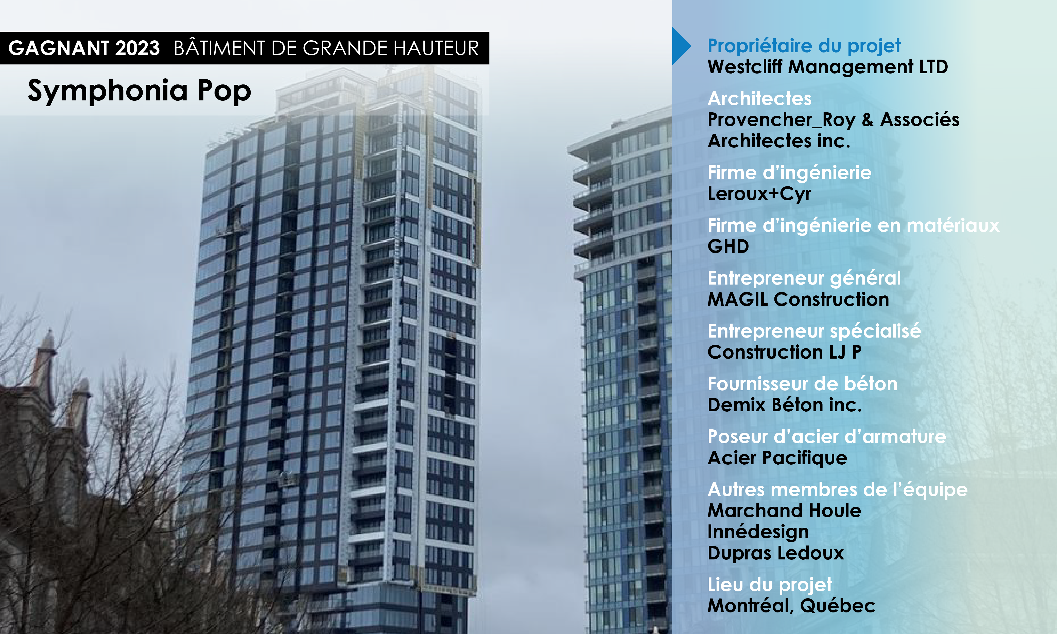 Le béton armé a été d’une importance capitale dans la conception de la tour Symphonia POP. L'essence même du concept architectural reposait sur son utilisation. Il aura permis, entre autres, d’introduire astucieusement tous les jeux de façades, d'asseoir les étages hors sols sur une trame structurale très irrégulière, de permettre des ajustements d’élévations importants dans l’intégration du bâtiment avec le niveau du sol naturel et la phase existante et de construire une fondation suffisamment rigide pour éviter l’utilisation de pieux-caissons sous l’emprise de la tour.
