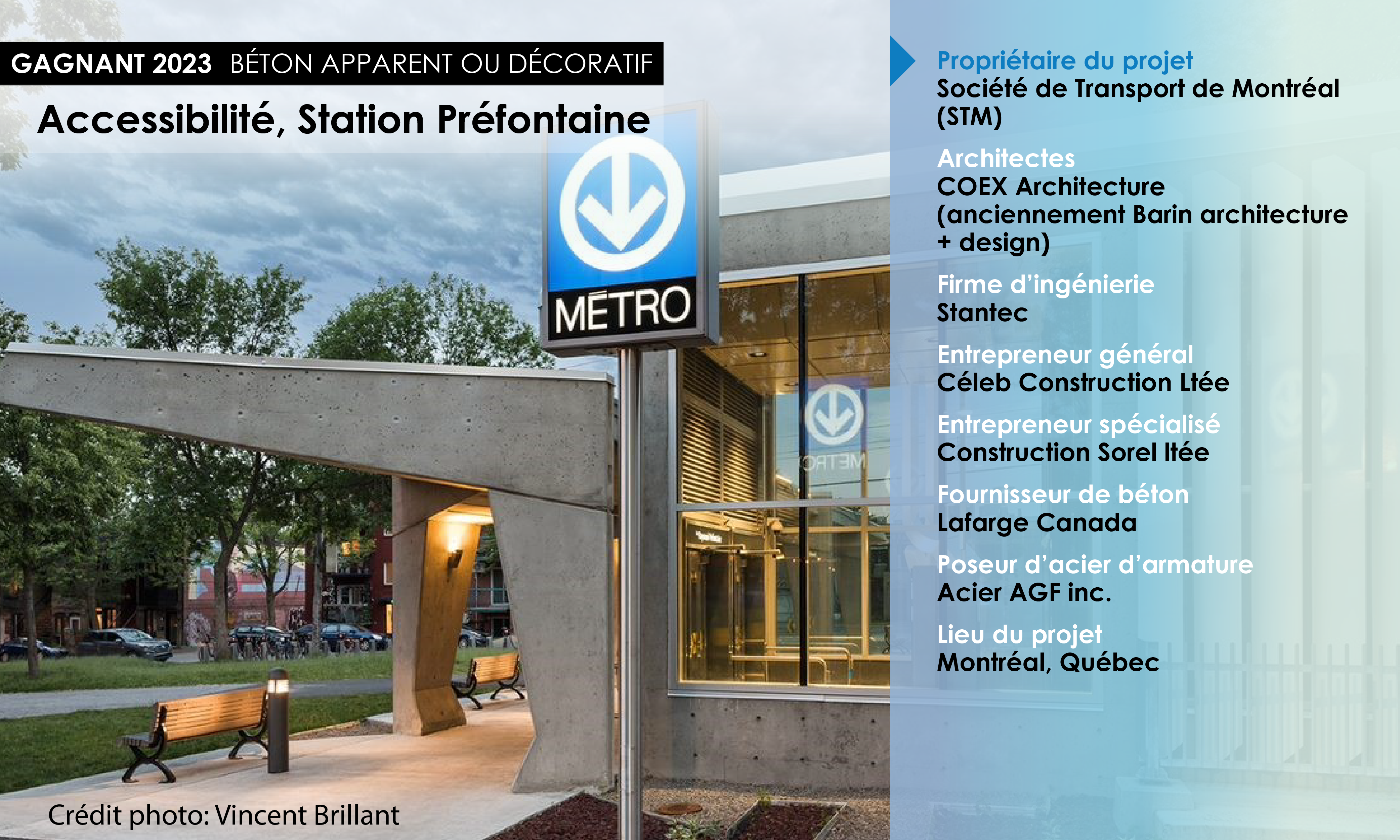 Matériau par excellence pour les infrastructures de transport telles que le métro, le béton caractérise l’intervention à la station Préfontaine. Une condition intemporelle peut être associée à ce matériel. On peut aussi évoquer sa durabilité et son faible coût d'entretien. Les qualités plastiques du béton ont permis d’adapter la matérialité aux besoins esthétiques, fonctionnels et architecturaux du projet. Ainsi, la force structurale du béton a permis des porte-à-faux de plus de cinq mètres créant des toitures qui s’élancent en exprimant le mouvement.