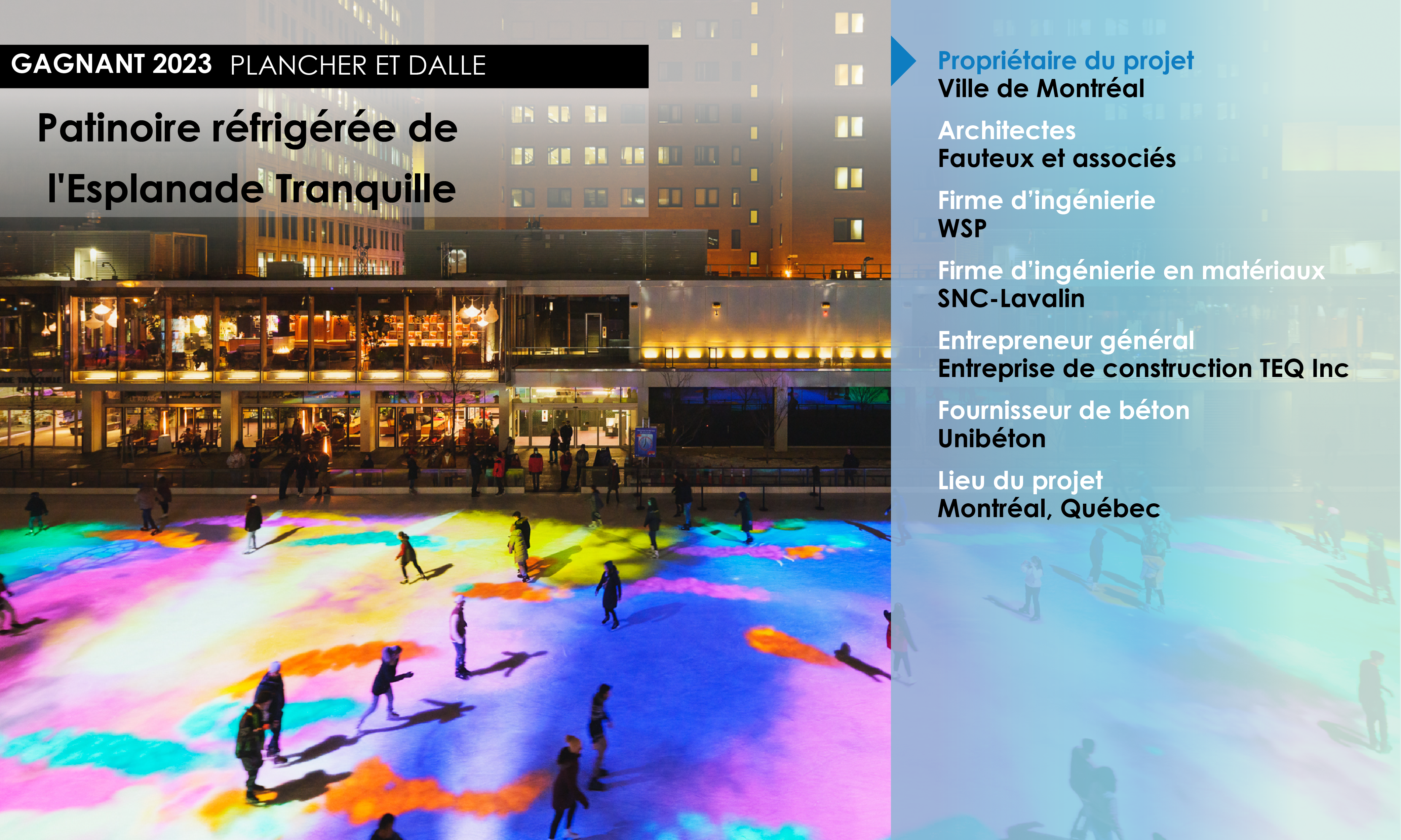 La dalle de la patinoire de l'Esplanade Clark a une superficie d'environ 1500 m2, ayant une épaisseur de 235 mm totalisant approximativement 353 m3 de béton. Une pente de 0,25 % a été déterminée afin de diriger l'accumulation d'eau vers les drains en périphérie de la dalle tout en gardant une épaisseur de surface de glace constante.