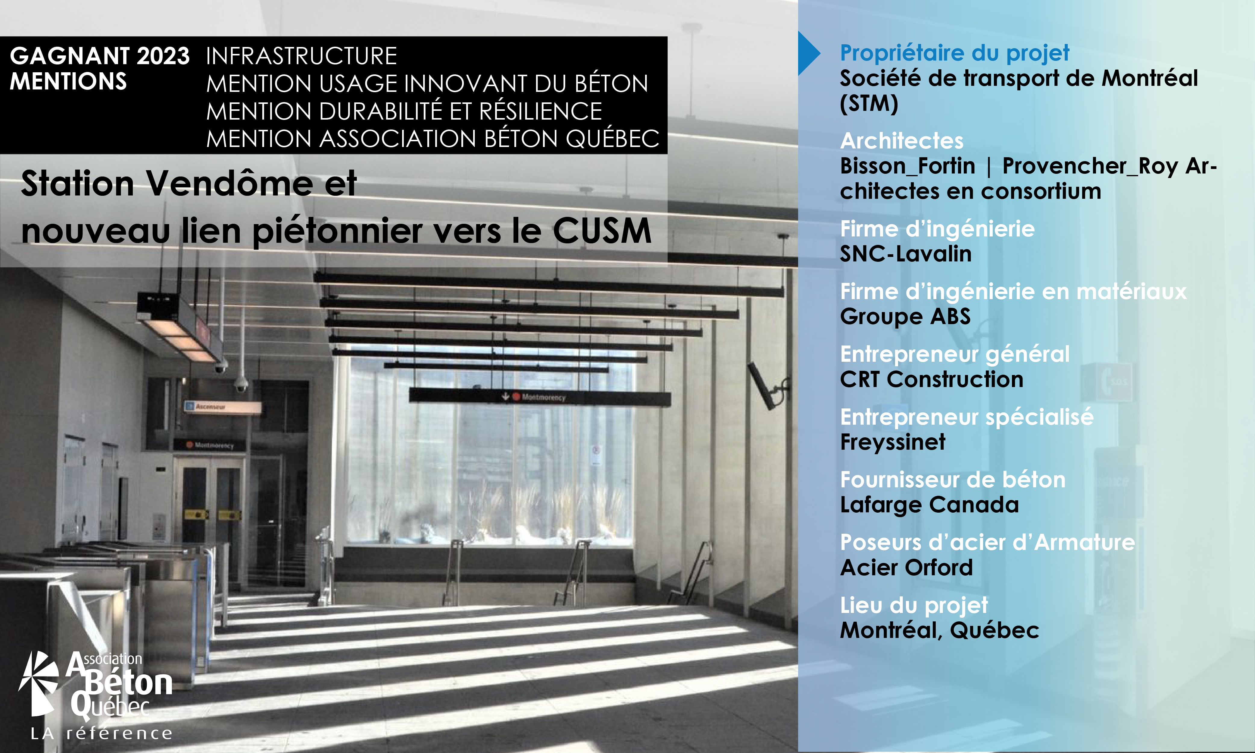 Le projet comprend les particularités suivantes : Un tunnel poussé en place et un tunnel préfabriqué pour minimiser l'interruption de service des trains de banlieue EXO (plus de 100 passages de train par jour) pour la construction du lien piétonnier sous les voies ferrées existantes. Un mur antichoc de 900 mm d'épaisseur, à environ 5 mètres au-dessus du sol pour résister à une charge d'impact de déraillement de train (2700kN), en vue de la projection d'une future 4e voie ferrée.