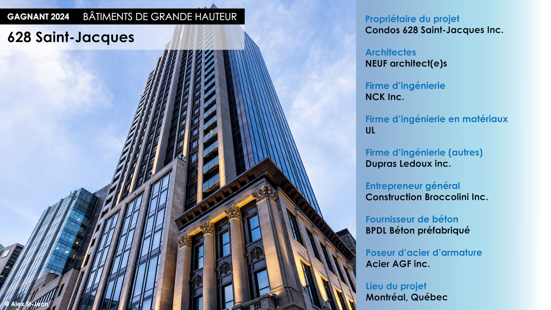Le 628 Saint-Jacques s'implante face à la tour de la Bourse de Montréal, à deux pas du Vieux-Montréal. Le bâtiment de 36 étages repose sur un édifice patrimonial de 1907, dont la façade donnant sur la Place Victoria a été entièrement restaurée, et celle sur la rue Gauvin a été reconstruite. La nouvelle construction s'inspire du style Art déco représentatif de certains bâtiments emblématiques du quartier. Une distinction s'opère entre le basilaire, dont l’ornementation s'assimile aux édifices patrimoniaux implantés sur le Square Victoria, et les étages, dont les lignes sobres et la fenestration abondante se tournent vers la ville contemporaine et le paysage lointain.