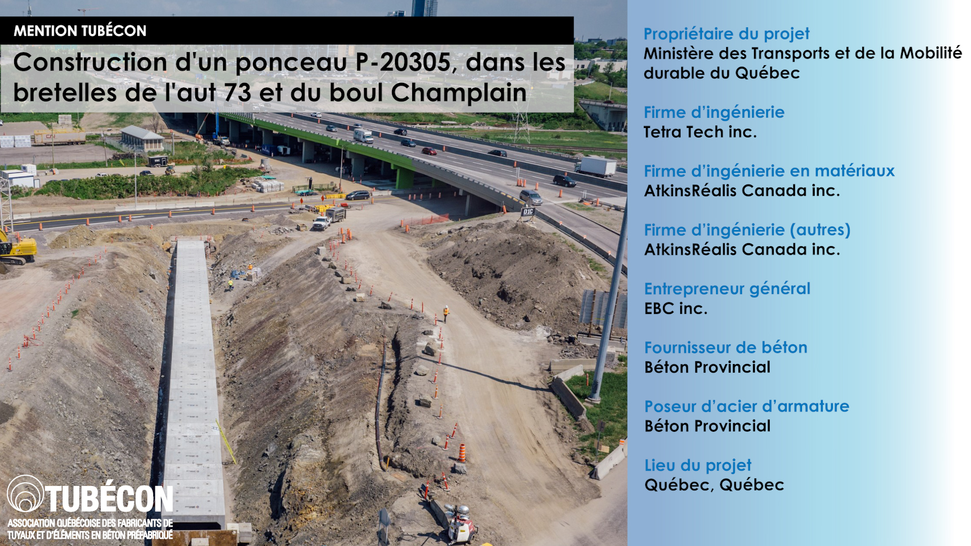 L'installation d'un ponceau en béton préfabriqué est rapide et efficace, ce qui permet de réduire les délais de construction globaux ainsi que le risque de retards sur le chantier dus au mauvais temps. Ceci est particulièrement important dans les projets comprenant des entraves majeures à la circulation. Seulement huit jours ont été requis pour l'installation du ponceau. Un délai largement supérieur aurait été requis pour une réalisation traditionnelle du type coffrage, ferraillage, bétonnage et mûrissement du béton.
