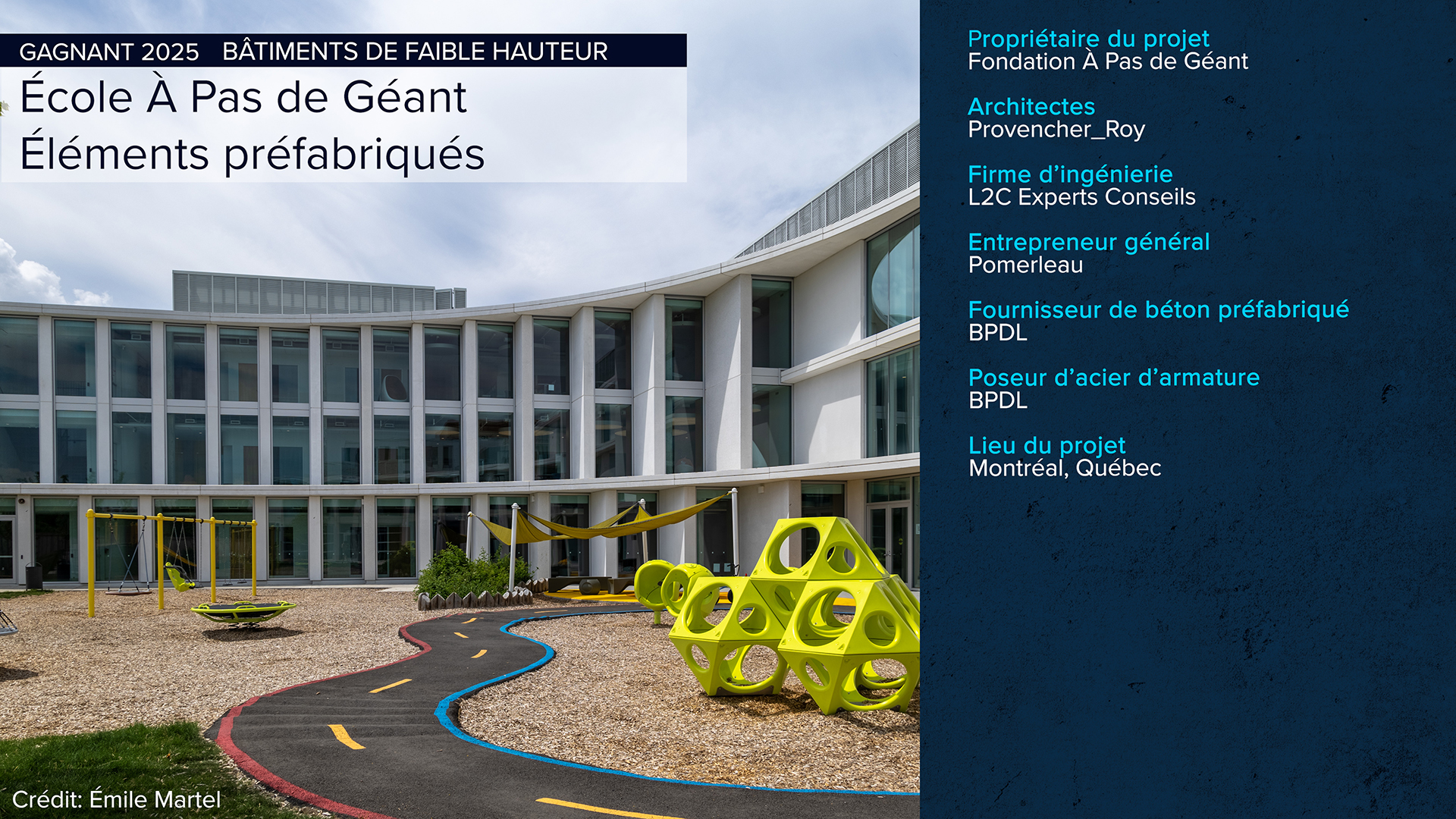 Le projet a nécessité la fabrication de 155 panneaux architecturaux, dalles et marquises, représentant 420 mètres cubes (14 830 pieds carrés). Les panneaux de béton, dimensionnés avec une variation de grandeurs d'ouverture, optimisent l'agencement intérieur en réponse aux besoins du centre. De plus, l'intégration de formes courbes démontre la polyvalence du béton dans la réalisation de formes architecturales variées.