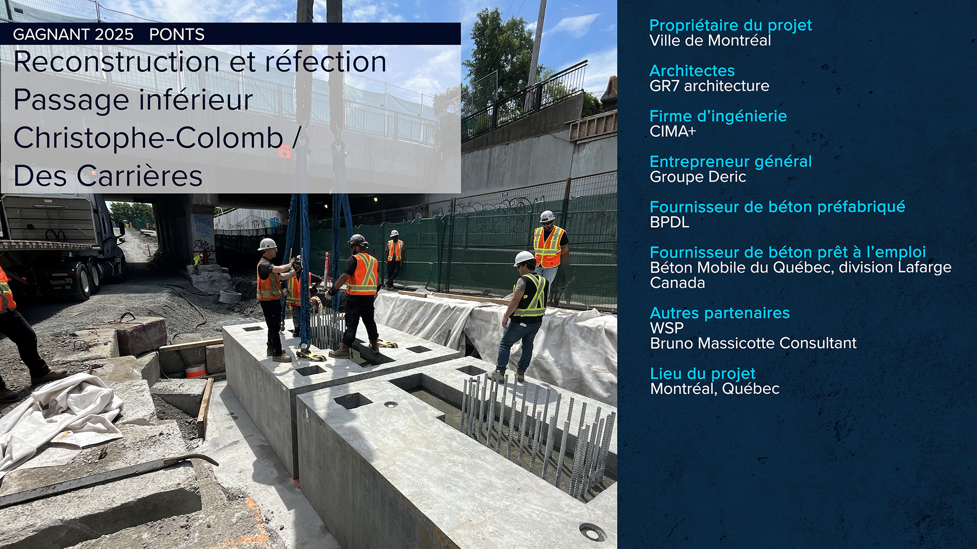 Le projet de reconstruction du pont routier du passage inférieur Christophe-Colomb/rue des Carrières met en valeur des avancées significatives dans l’utilisation du béton, intégrant à la fois innovation, performance et durabilité. Réalisé en collaboration avec le professeur Bruno Massicotte, le concept final a bénéficié des dernières recherches en matière de préfabrication et de performance sismique, notamment pour les joints en béton fibré ultra-haute performance (BFUP).
