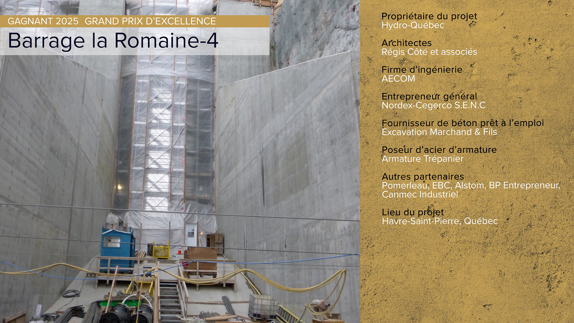 Durant tout le chantier, des tonnes de granulats excavés et concassés sur place ont permis de fabriquer et couler plus de 42 450 m3 de béton. Directement au cœur du chantier, une usine à béton moderne a permis la fourniture de béton de masse de formulation à faible chaleur d’hydratation comportant du ciment Portland de type LH, livré à des températures comprises entre 3 et 7°C l’année durant. Un laboratoire de contrôle de qualité des matériaux était présent à temps plein au chantier pour la surveillance et l’échantillonnage des coulées de béton. L’isolement du chantier, l’échéancier serré, la pandémie de COVID-19 et les conditions hivernales longues (jusqu’à -40C) ont représenté un défi pour toute l’équipe de construction.
